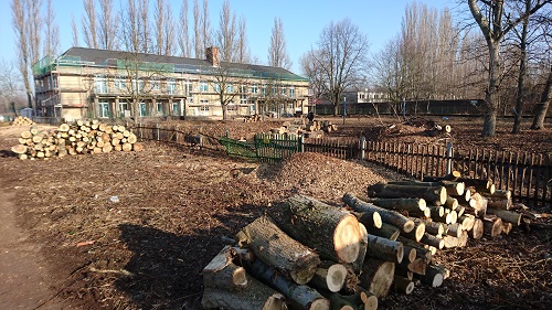Die Holzstücke und Scheiben der gefällten Bäume sind für den zukünftigen Garten und für den Garten unserer anderen Kita, der KITA Waldräuber, vorgesehen. Dort werden sie zu Erstellung von natürlichen Hindernissen im Garten genutzt. Sehr gut zu gebrauchen sind sie auch für die noch bessere Ausgestaltung unseres Zauneidechsen-Paradieses. Die Tierliebe und Naturverbundenheit der früheren Nutzer konnten wir, nachdem das Gestrüpp sich gelichtet hat, auch noch feststellen. Ein umgefallenes und teilweise zerstörtes Insektenhotel tauchte plötzlich wieder auf. Leider nicht mehr so schön anzusehen und nicht gut zu benutzen. Aber eine sehr gute Inspiration. Ein neues Insektenhotel ist schon geplant.