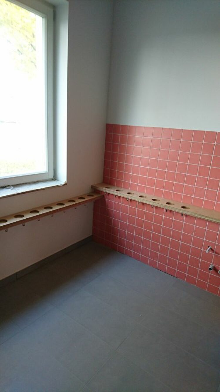 Fast startklar ist die große Küche, in der die Mahlzeiten für die Adlerküken täglich frisch zubereitet werden. Es fehlt nur noch die Beleuchtung – und dann könnte es im Prinzip losgehen. Die Ausstattung der Küche wurde fachmännisch zusammengestellt und wartet darauf, von unseren Köch*innen erstmals getestet zu werden.